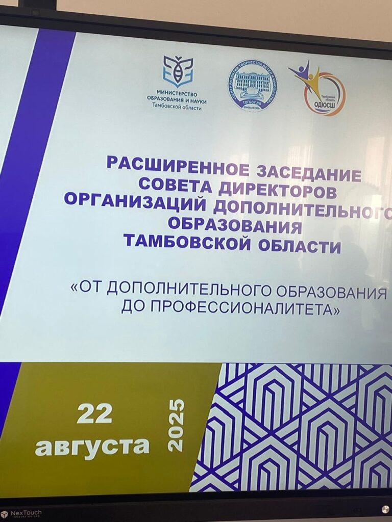 👩💼 22 августа директор Дома детского творчества Курбатова Т.Э. приняла участие в расширенном заседании Совета директоров организаций дополнительного образования Тамбовской области на тему «От дополнительного образования до Профессионалитета».